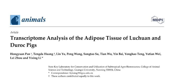 近日,tyc7111cc太阳成集团动物科学专业2019级本科生潘鸿远在SCI期刊《animals》 (JCR一区,中国科学院二区)以第一作者发表题为“Transcriptome Analysis of the Adipose Tissue of Luchuan and Duroc Pigs”的研究论文。该论文通讯作者为tyc7111cc太阳成集团李一星副研究员,作者还包括白银、滕永昊、韦宇天等动物科学专业本科生。该研究受到自治区大学生创新创业训练项目以及太阳成tyc7111cc大创项目倍增计划重点项目的支持。
