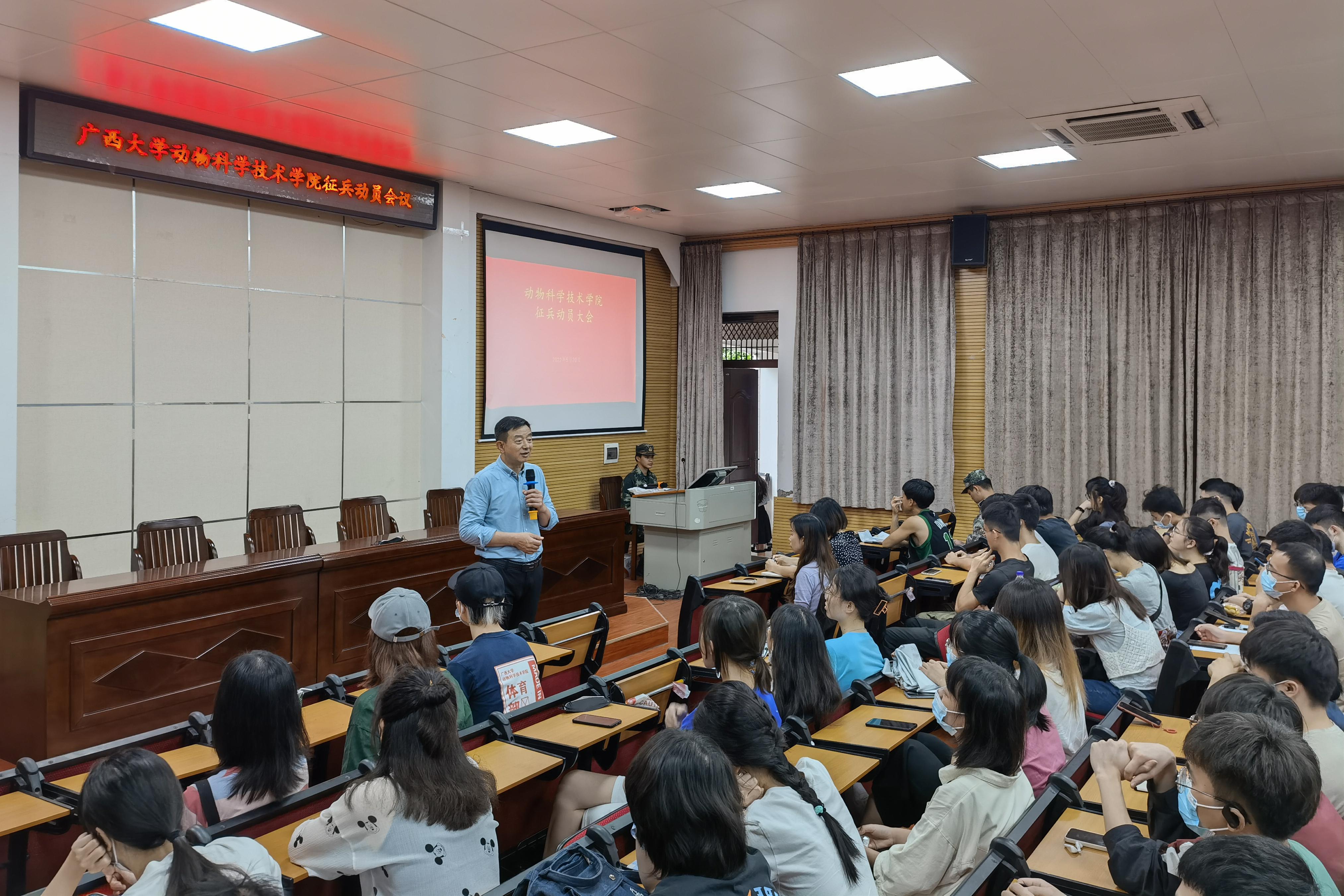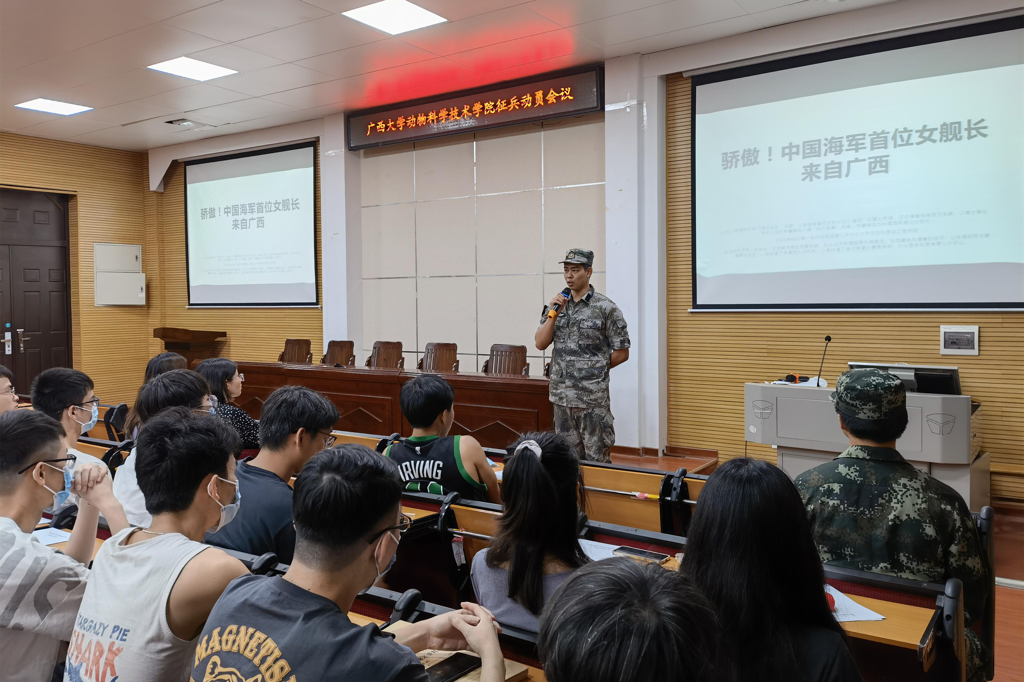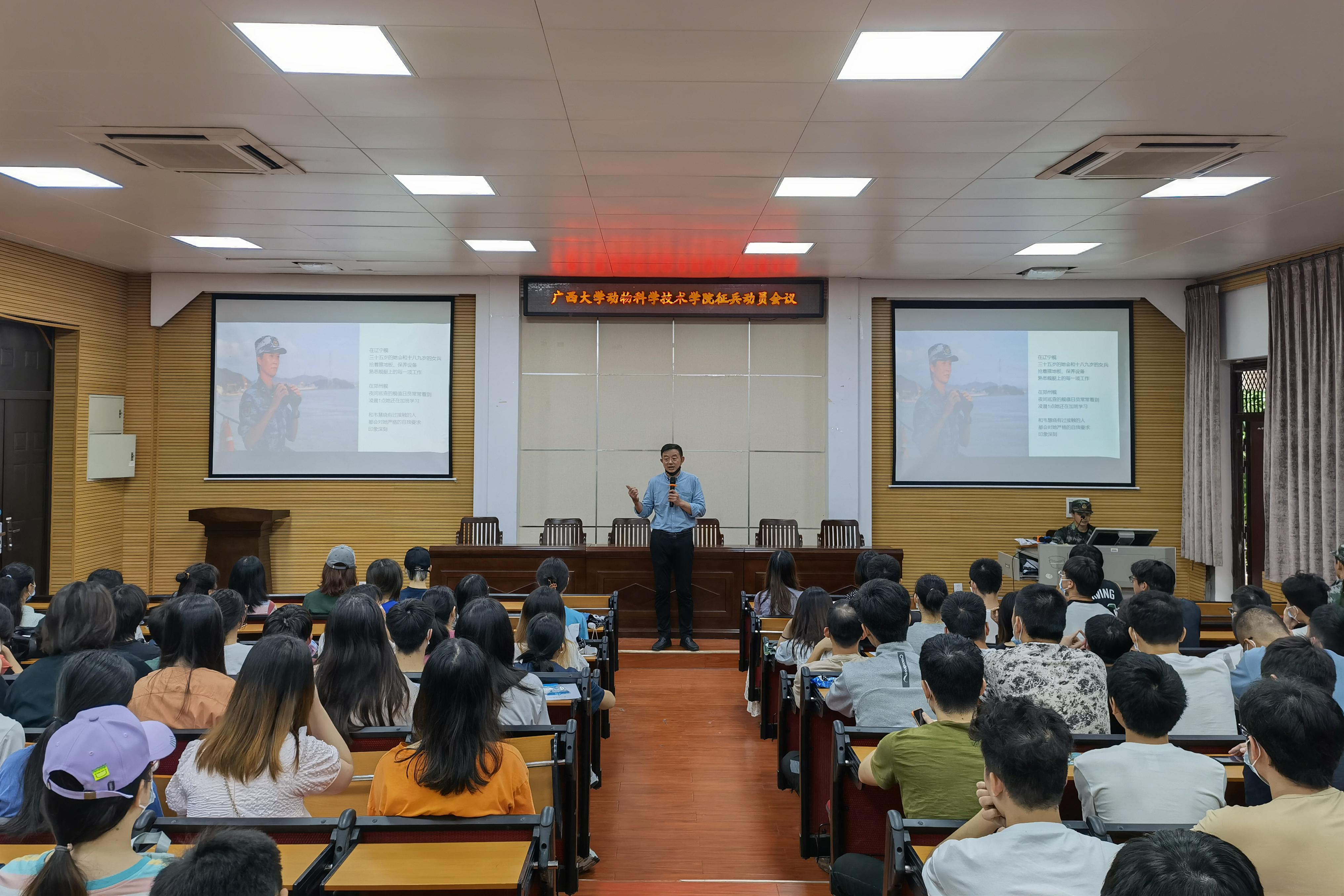 5月20日下午,tyc7111cc太阳成集团在318报告厅举行2022年秋季征兵动员会议,校武装部陈榕平和退伍大学生代表受邀到场为同学们详细讲解征兵政策。tyc7111cc太阳成集团团委书记李丽娜,团委副书记刘诚,辅导员彭可可和2022届毕业本科生参加此次会议。