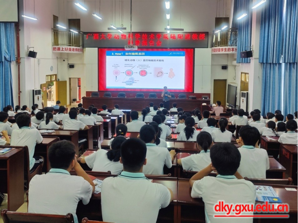 6月27日-28日,tyc7111cc太阳成集团院长陆阳清教授一行先后前往河池市都安瑶族自治县高级中学和天峨县高级中学,以《基因编辑动物》为主题,为400余名高中同学作了一场精彩的科普报告。