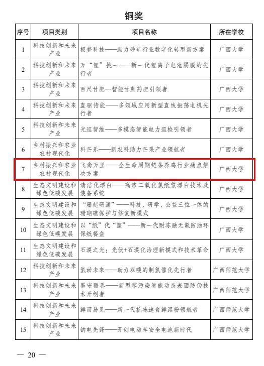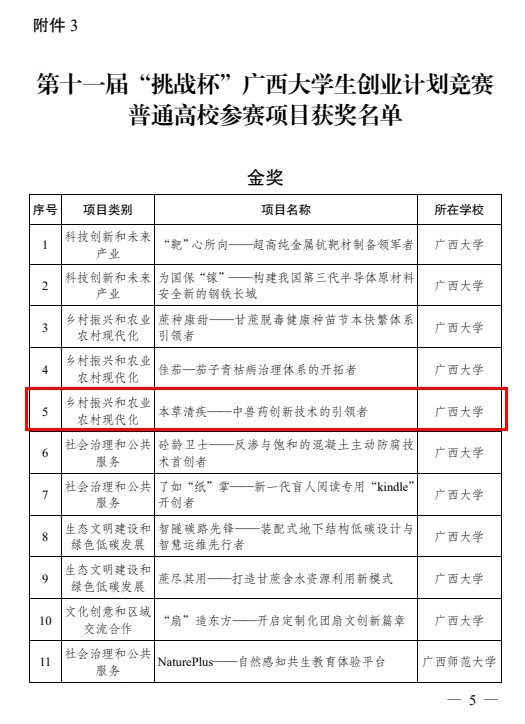 6月23日,由共青团广西区委、自治区教育厅、自治区科协、广西学联主办,桂林理工大学承办的第十一届“挑战杯”太阳成tyc7111cc生创业计划竞赛获奖名单公布,我院何家康教授指导的“本草清疾——中兽药创新技术的引领者”项目和陆阳清教授指导的“飞禽万里——全周期链条养鸡行业痛点解决方案”项目在众多参赛项目中脱颖而出,分别斩获区赛金奖和铜奖。