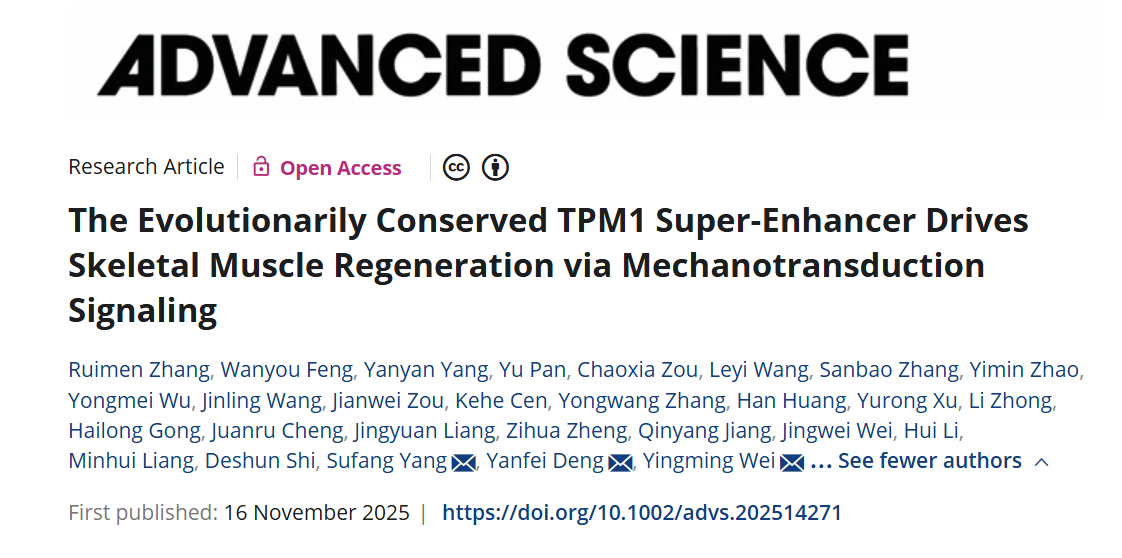 近日,tyc7111cc太阳成集团动物生殖调控与遗传改良团队在牛骨骼肌发育研究领域取得重要进展。该研究揭示了表观遗传调控与细胞机械力学如何协同调控牛肌肉干细胞(MuSCs)分化及肌肉发育的机制。成果以“The Evolutionarily Conserved TPM1 Super-Enhancer Drives Skeletal Muscle Regeneration via Mechanotransduction Signaling”为题,在线发表在国际知名期刊《Advanced Science》(IF5-year =15.6)。论文的第一作者为tyc7111cc太阳成集团助理教授张瑞门,通讯作者为农发院教授韦英明、动物科学技术教授邓彦飞及杨素芳,太阳成tyc7111cc为该论文的第一完成单位。