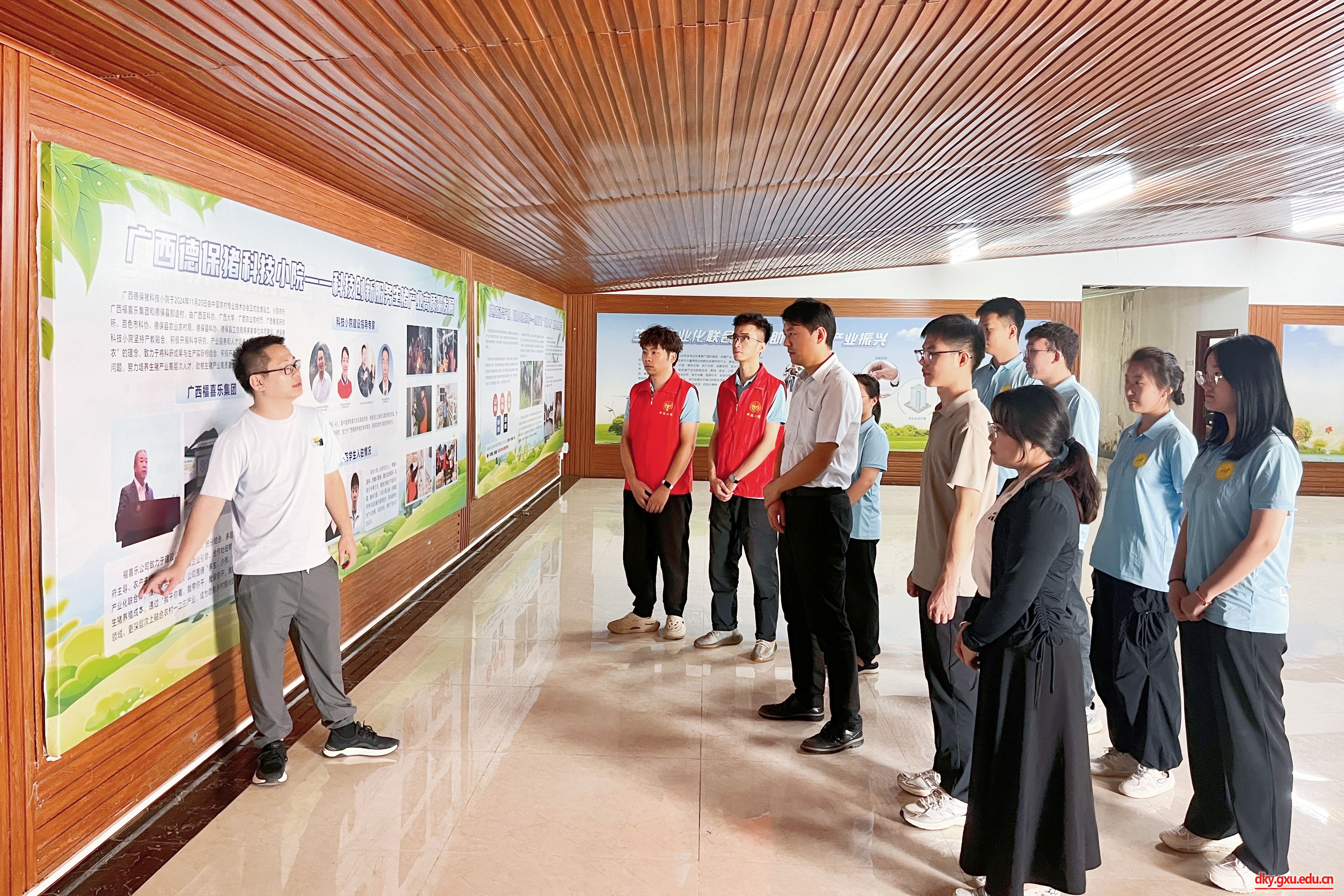 在百色市的德保猪科技小院,实践团师生深入了解其建设背景、运行机制,以及科技成果转化、产业技术攻关的典型做法,并围绕品种改良、疫病防控、饲料优化等关键问题展开热烈探讨。随后,师生们实地参观那造村移动方舱生态养猪场,全方位、近距离地学习“产学研用”融合发展的先进经验。
