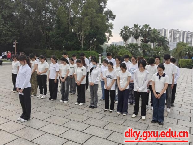 怀着崇敬之心,师生们随后前往南宁市南湖公园革命烈士纪念碑。学院团委副书记马朝阳带领大家重温那段烽火岁月:“80多年前,邓小平、李明瑞、韦拔群等革命先辈领导百色、龙州起义,创建红七军、红八军,在左右江地区开辟了西南边疆唯一的革命根据地,用鲜血铸就了‘百折不挠、实事求是、依靠群众、团结奋斗’的红色丰碑。”全体人员肃立默哀,向革命先烈敬献花圈,深切缅怀为民族解放事业献出生命的英雄们。