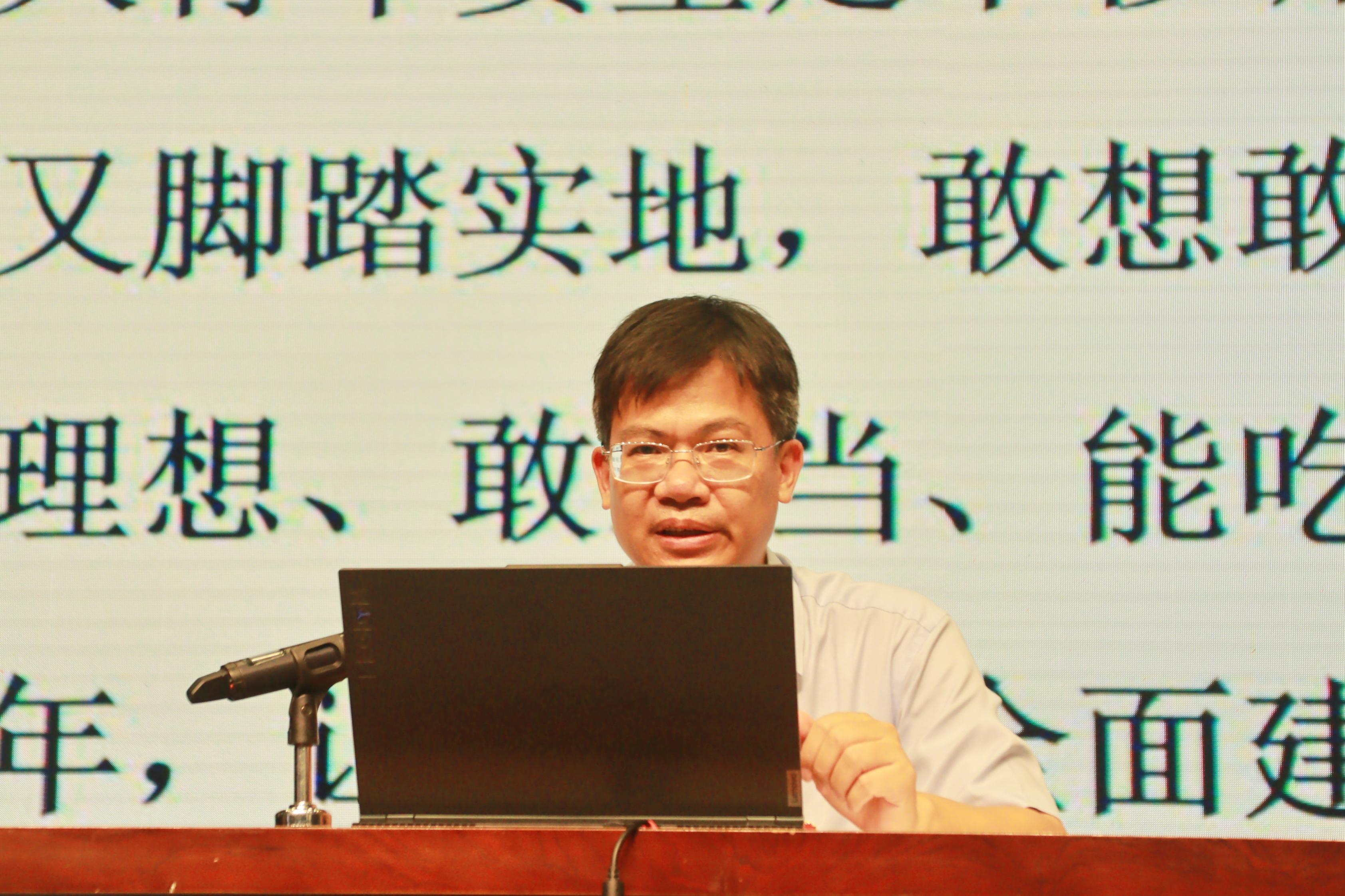 9月17日晚,tyc7111cc太阳成集团党委书记韦小强以《与时代同心同向,在激情奋斗中绽放青春光芒》为题,在大礼堂为2023级全体新生作入党启发教育专题报告。
