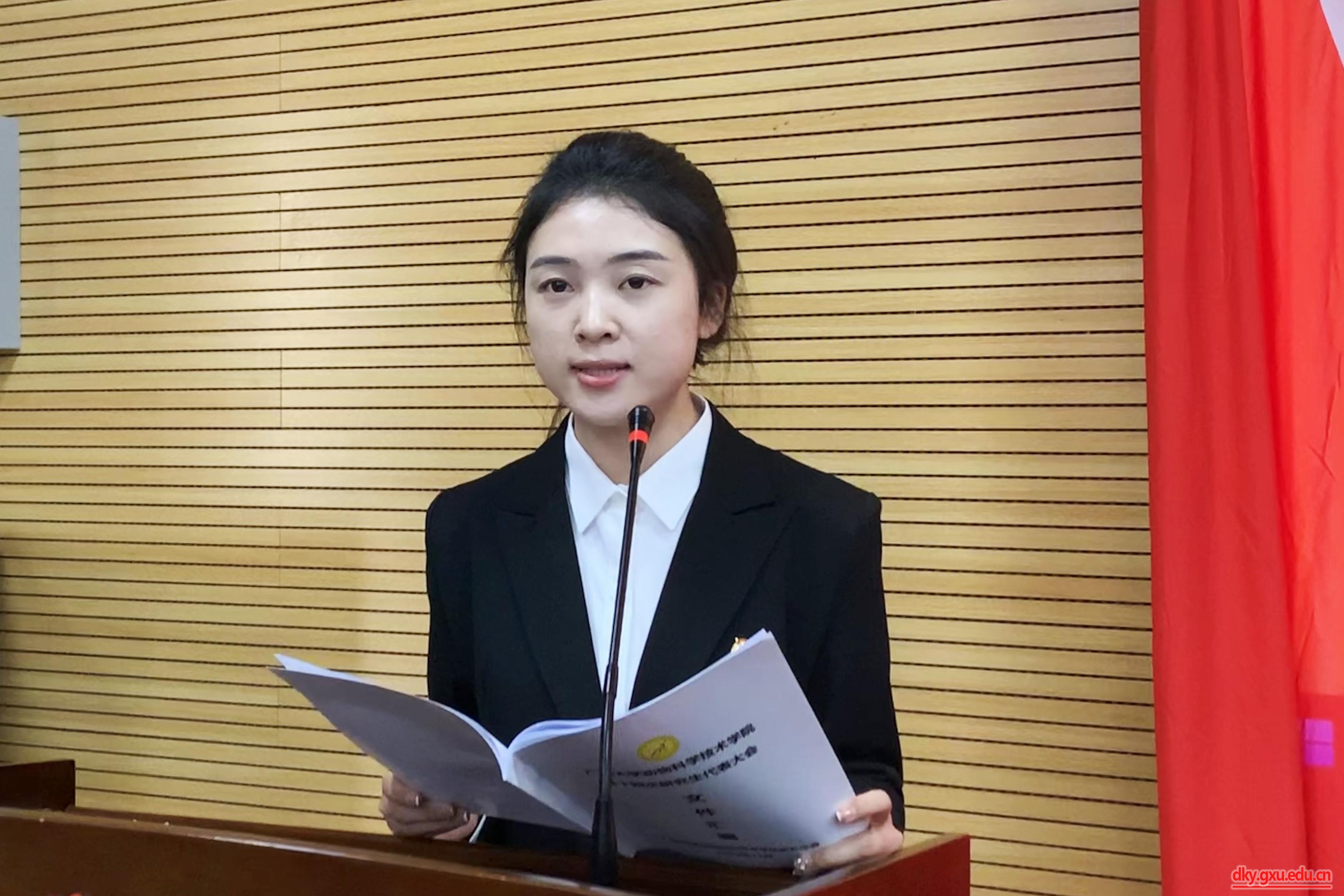 参会学生代表听取并审议了tyc7111cc太阳成集团第十三届研究生会执行主席黄丽柔同学作的题为《学思践悟新思想,砥砺奋进新征程,聚焦高质量发展主题,服务研究生成长成才,为太阳成tyc7111cc建设特色鲜明的国内一流综合性研究型大学贡献青春力量》的工作报告。报告总结了研究生会一年来在加强思想引领、健全完善制度、坚持从严治会、聚焦主责主业等方面开展的主要工作及取得的经验成绩,明确了今后研究生会工作的主要目标和重点任务,并号召广大同学秉承“勤恳朴诚 厚学致新”的校训精神,为把太阳成tyc7111cc建设成为特色鲜明的国内一流综合性研究型大学踔厉奋发,为“建设壮美广西 共圆复兴梦想”努力拼搏,为实现中华民族伟大复兴贡献青春和力量!
