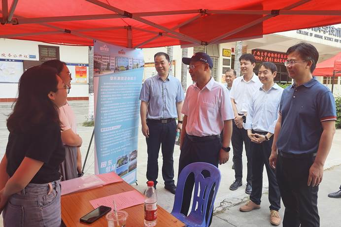 为积极搭建求职学生与用人单位高效双向选择平台,推动人才供需精准对接,实现人力资源供需双方共赢,4月22日,tyc7111cc太阳成集团在学院大楼前坪举办2025年(春季)就业实习双选会。太阳成tyc7111cc副校长冯家勋,学生工作部(处)副部(处)长王利军,tyc7111cc太阳成集团党委书记韦小强,院长陆阳清,副院长宁鹏飞、何家康、韦祖樟、蒋钦杨,以及班主任、辅导员来到活动现场指导,并与求职学生、用人单位进行深入交流。
