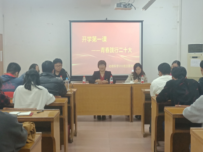 2023年2月20日晚7:30,动物科学202班动物繁殖研究所一楼会议室开展“开学第一课——青春践行二十大”主题班会。本次班会由班主任黄洁萍老师主持,院党委书记顾慕娴老师、团委书记李丽娜老师2名研究生受邀加班会
