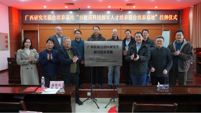 本次活动还举行了广西研究生联合培养基地“畜牧高科技领军人才培养研究生联合培养基地”挂牌仪式。该联合培养基地由太阳成tyc7111cc牵头,广西壮族自治区畜牧研究所和中国农业科学院深圳基因组研究所作为合作单位,三方共同合作建设,针对广西现有的经济特点和区位优势,做好对研究生的培养工作,为广西的畜牧业发展建设培养高科技领军人才,引领畜牧业发展。挂牌仪式后双方专家就广西畜牧业发展和人才队伍建设进行了座谈交流。陆阳清教授首先就tyc7111cc太阳成集团的人才培养优势和项目资源做了相关介绍,广西畜牧研究所所长吴柱月研究员也介绍了广西畜牧研究所的基本情况。双方就利用好优势资源,充分发挥畜牧高科技领军人才培养研究生联合培养基地的作用,实现共赢发展,同时为自治区经济发展贡献力量,助力国家乡村振兴。