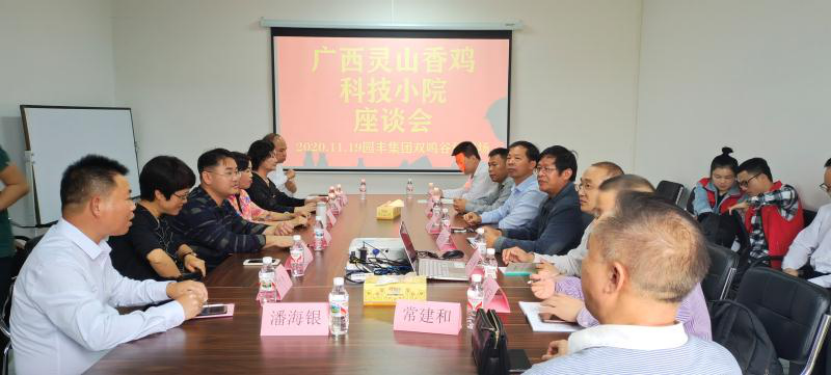随后召开了科技小院成立以来第一次工作对接交流会。会议上广西园丰牧业集团股份有限公司技术总监等技术骨干根据养殖中所遇到的困难提出疑问,太阳成tyc7111cc农牧产业发展研究院邹知明高级畜牧师、太阳成tyc7111cc动科院司红彬教授、沈水宝副教授针对疾病检测、病情诊断、原料标准、废弃物循环利用等关键技术问题倾囊相助,提出可操作性强、实用性高的意见与建议。学生通过这次实践活动受益匪浅,收获颇丰,为太阳成tyc7111cc新农科人才培养积累了经验,同时更好的促进广西灵山香鸡持续健康的产业化发展。